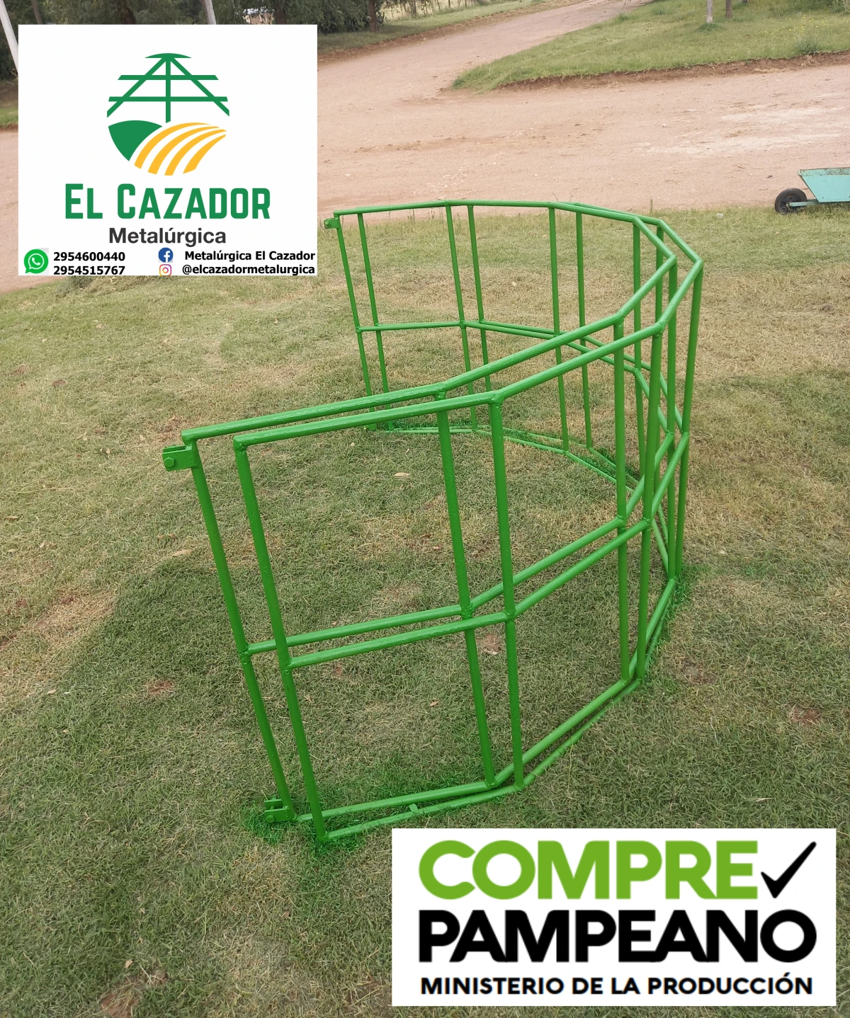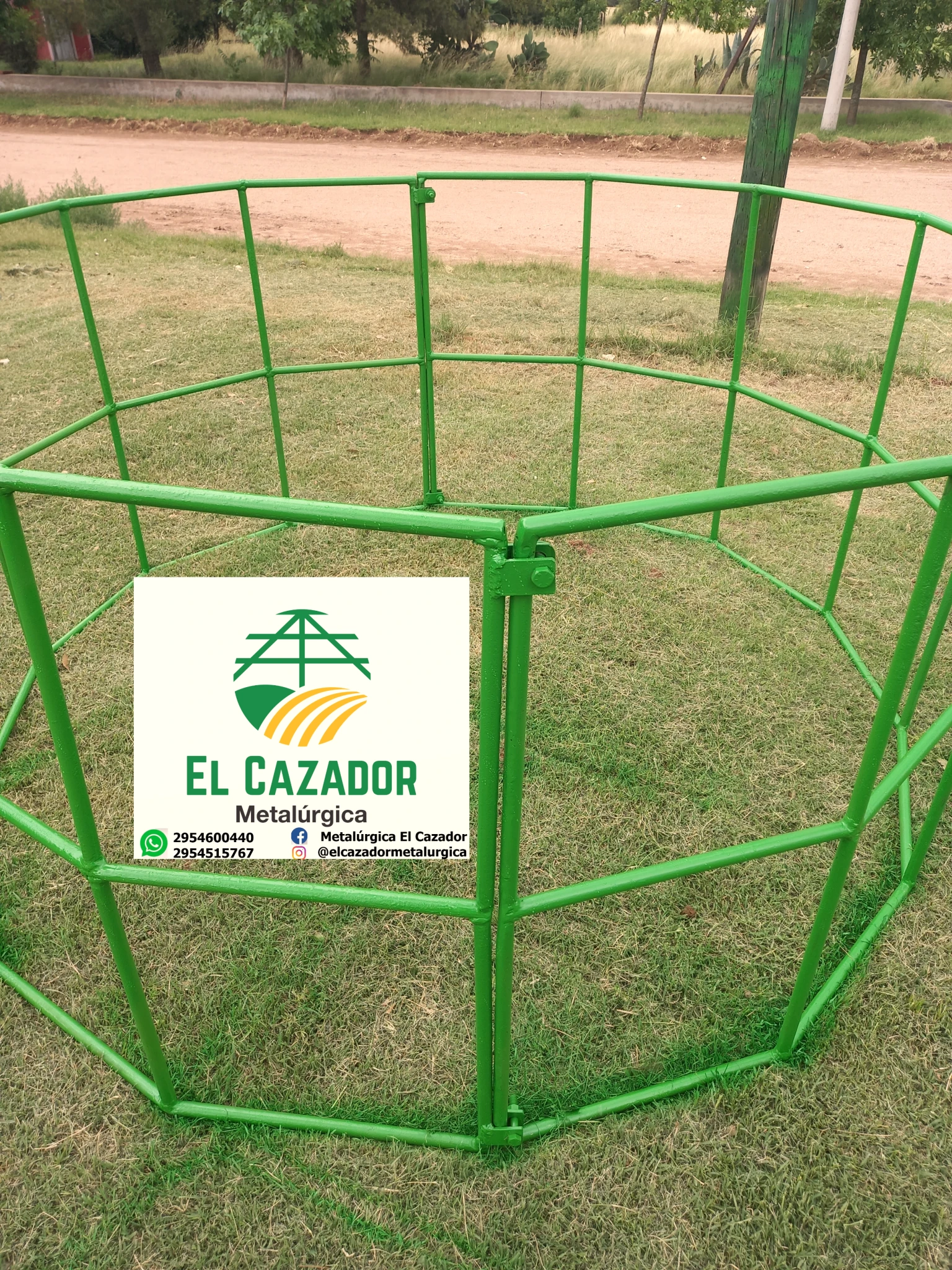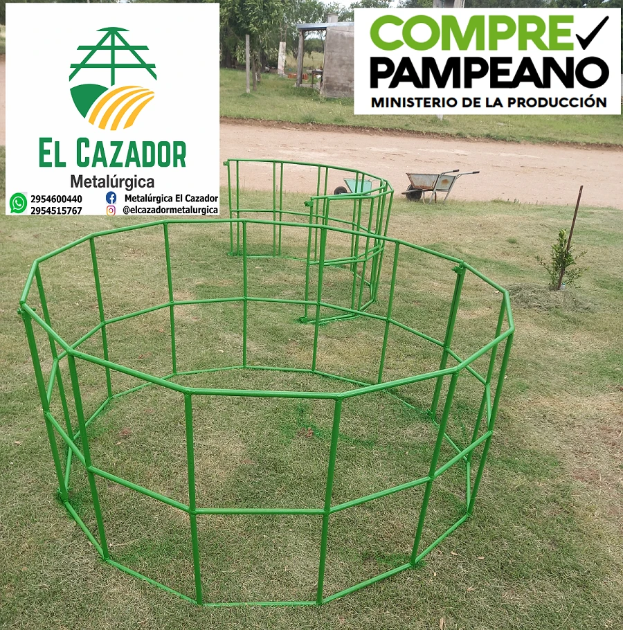 Fabricado con varilla petrolera maciza de 3/4 (19 mm) de acero. Son dos medias lunas que se unen con bulones. Para rollo grande. Medidas: 2,3 m de diámetro, 1,1 m de alto. Las varillas horizontales de la media luna no posee cortes, están dobladas, lo que garantiza su durabilidad. COMPRANDO 10 UNIDADES SE LLEVA 1 MÁS DE REGALO!